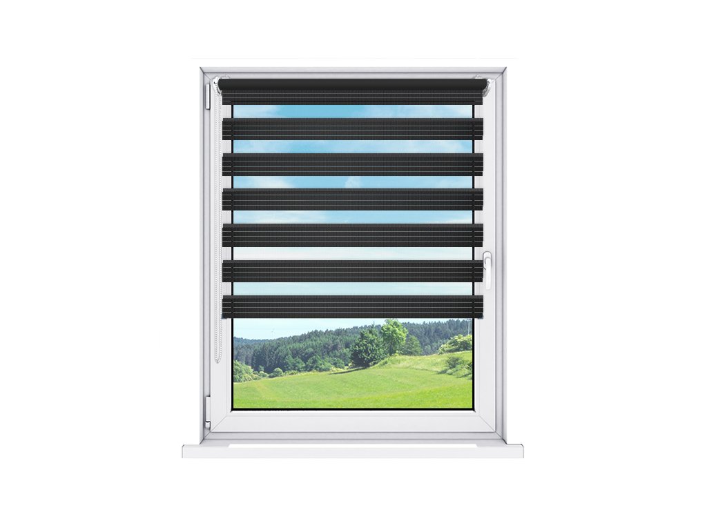Systém rolet DEN A NOC je velice moderním způsobem jak regulovat stínění ve dne a zabezbečit pocit soukromí v noci. Princip tohoto systému je založen na dvou vrstvách látky kde se střídají průhledné a neprůhledné vodorovné motivy či pruhy. Navíjením jedné vrstvy látky dochází k regulaci průniku světla. Řetízkovým ovládáním si můžete navolit pruhy látky tak, aby jste v interiéru vytvořili světlo nebo tmu. Roletu můžete zastavit v libovolné výšce.