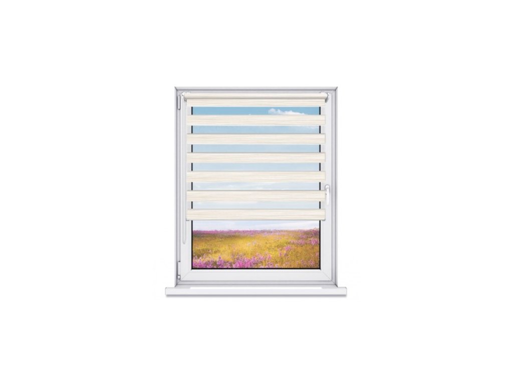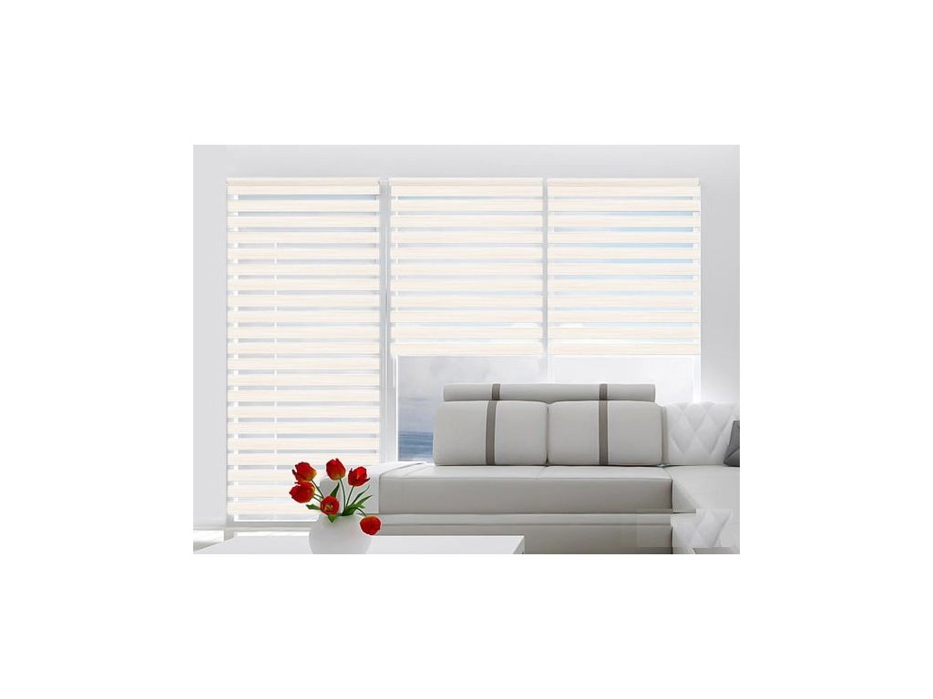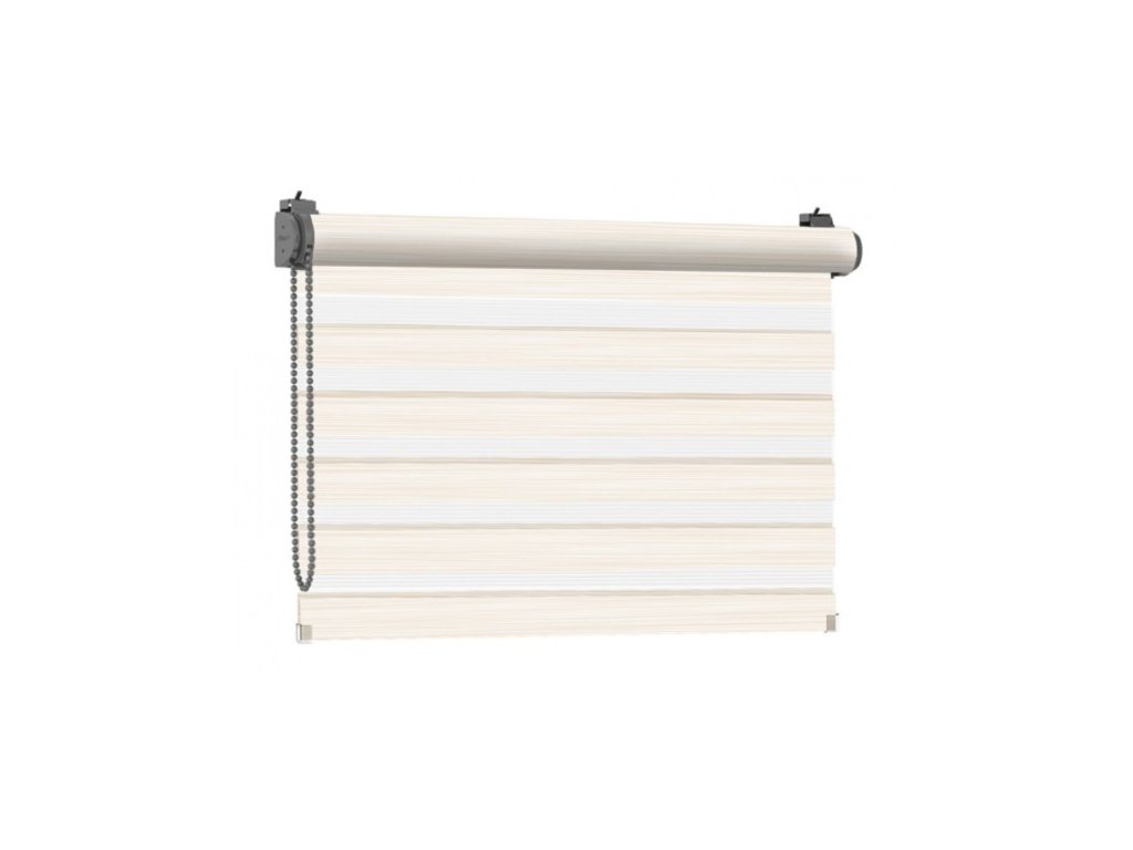 Systém rolet DEN A NOC je velice moderním způsobem jak regulovat stínění ve dne a zabezbečit pocit soukromí v noci. Princip tohoto systému je založen na dvou vrstvách látky kde se střídají průhledné a neprůhledné vodorovné motivy či pruhy. Navíjením jedné vrstvy látky dochází k regulaci průniku světla. Řetízkovým ovládáním si můžete navolit pruhy látky tak, aby jste v interiéru vytvořili světlo nebo tmu. Roletu můžete zastavit v libovolné výšce.