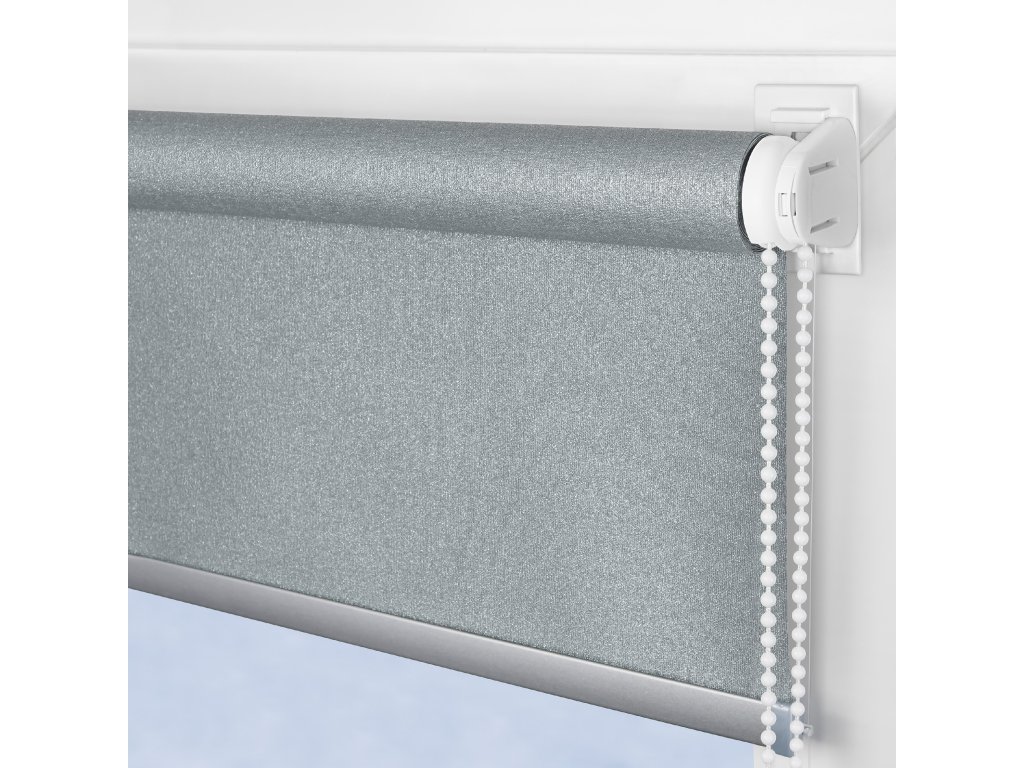Roleta MIDI SHINE – ocelová. Brokátově lesklá 100 % polyesterová látka, zatemnění 100 %, montáž bez vrtání na křídlo či rám, oboustranné ovládání řetízkem.