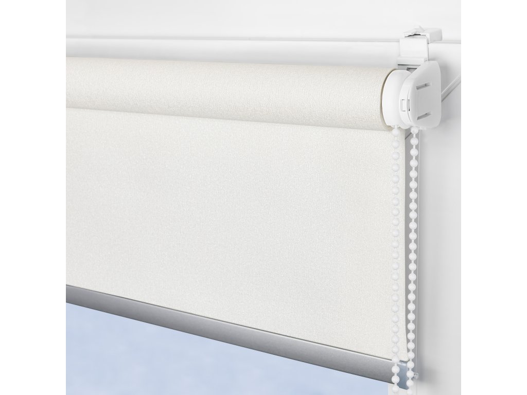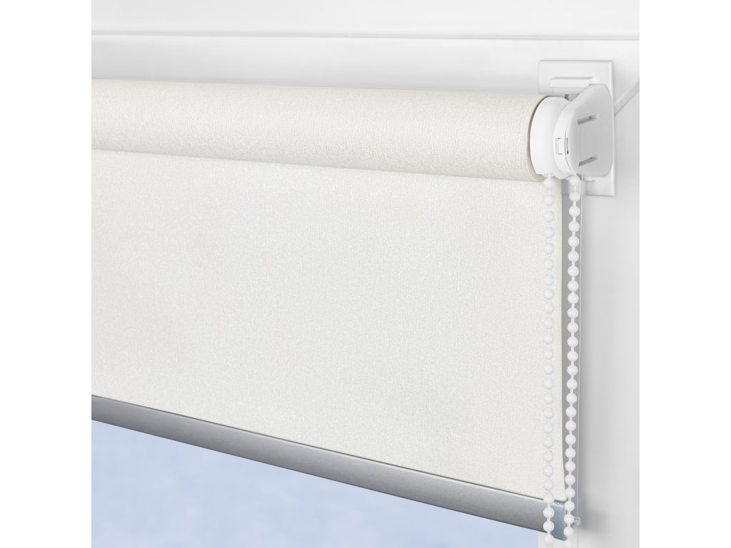 Roleta MIDI SHINE – perlová. Luxusní brokátově lesklá polyesterová látka (100 %) pro 100% zatemnění, montáž bez vrtání na rám nebo křídlo, ovládání oboustranné řetízkem.